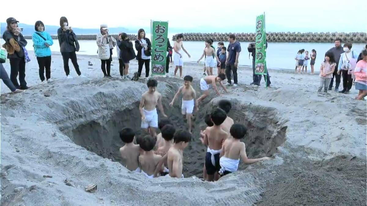 今年の6月2日には、地域の小学生およそ30人が参加しました。「おろごめ」では、砂浜に縦横2.5メートル、深さ1.5メートルの「苙(おろ)」と呼ばれる穴を掘り、「親頭」と呼ばれる武士に見立てた上級生が、「小頭」と呼ばれる馬に見立てられた下級生を穴の外に追い出すという力比べを行います。多くの地域の人たちが見守る中、子どもたちは砂の中で奮闘し、参加した児童からは「手強かった」「楽しくできた」といった声が聞かれました。見守る地域の人々は、子どもたちの健やかな成長を祈っていました。