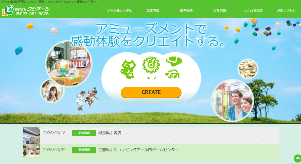 前職場である印刷会社の退職後、前職場にホームページ制作できる者が不在となったために引き受けたホームページ制作依頼。クライアントが、ゲームセンターなどにUFOキャッチャーやスロットを貸し出しするアミューズメントレンタル事業者であったため、プログラミングでスロットを作り、Webサイトの目玉として設置した意欲作です。