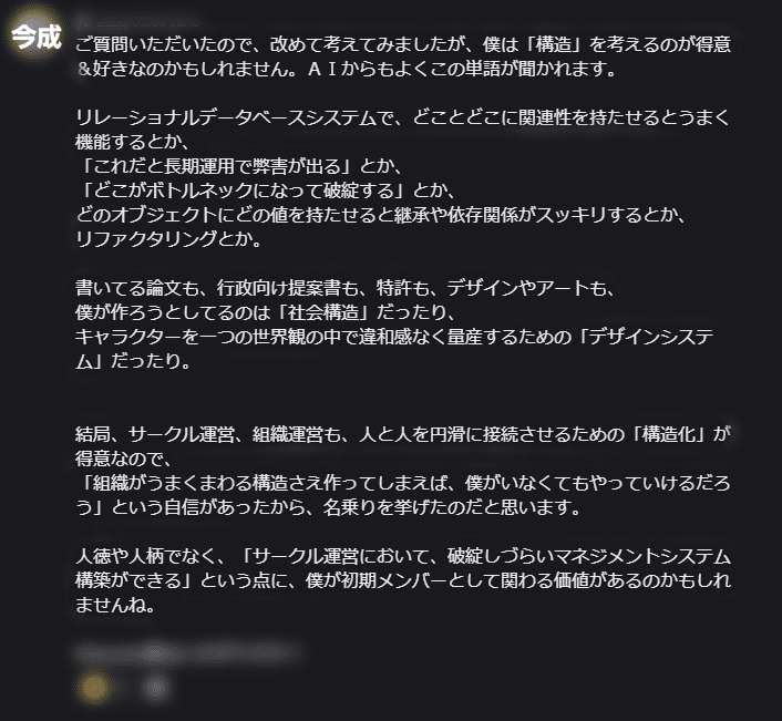今成は、「人に許された唯一の運命を変える方法とは、選択と決断を継続し続けること」との信条を持っています。運命というものがあるのだとして、それはたった一度や二度の選択で変わるものではなく、何度も何年も繰り返し特定の選択を継続し続けることで、ようやく変更可能なものであると考えています。